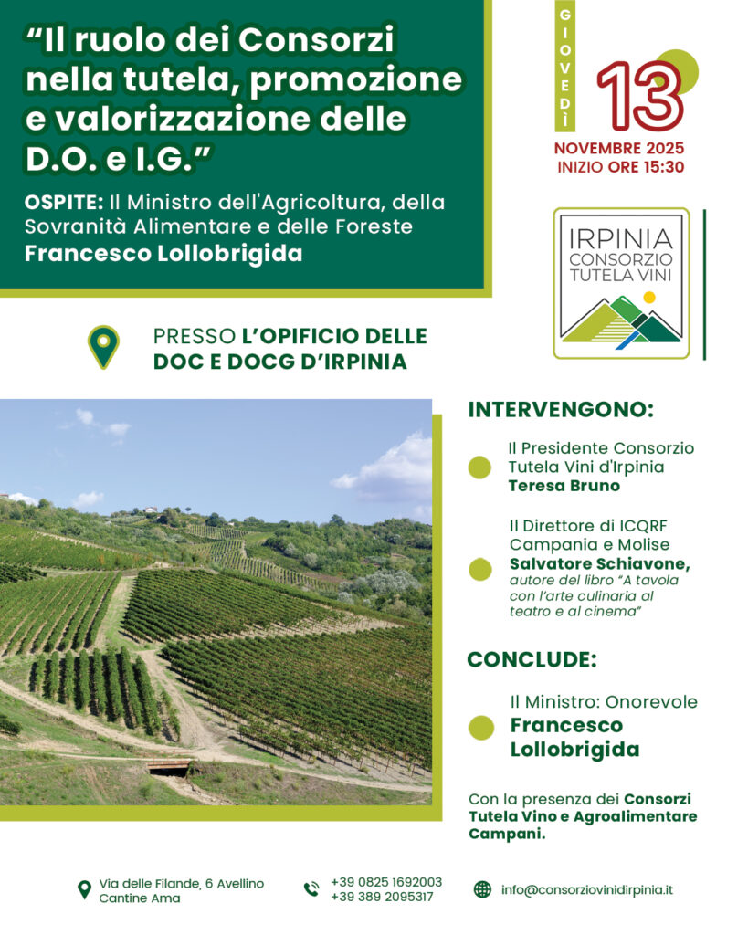L’incontro, dal titolo “Il ruolo dei Consorzi nella tutela, promozione e valorizzazione delle D.O. e I.G.”, si terrà giovedì 13 novembre 2025, alle ore 15:30, presso l’Opificio delle DOC e DOCG d’IrpiniaVia delle Filande, 6, Avellino (Cantine Ama).